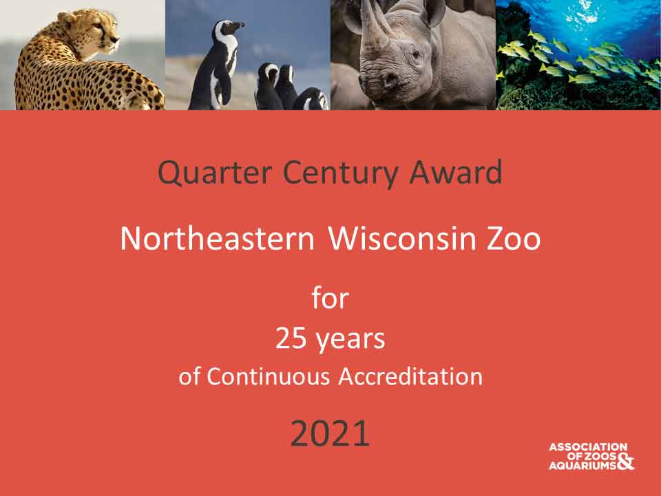 The NEW Zoo & Adventure Park has earned the Quarter Century Award from the Association of Zoos & Aquariums (AZA). The award is presented to organizations who have maintained 25 years of continuous accreditation.  The NEW Zoo was first accredited in 1996.